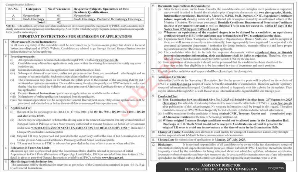 Federal Public Service Commission (FPSC) invites applications for the above-listed positions as advertised in The News on 13 July, 2025 for various departments in Islamabad. Candidates with qualifications ranging from Bachelor’s to PhD in relevant disciplines are encouraged to apply.