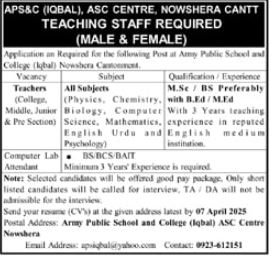 Army Public School & College (APS&C) is inviting applications for the following teaching and support staff positions as per the advertisement published in Mashriq Newspaper on 31 March, 2025: