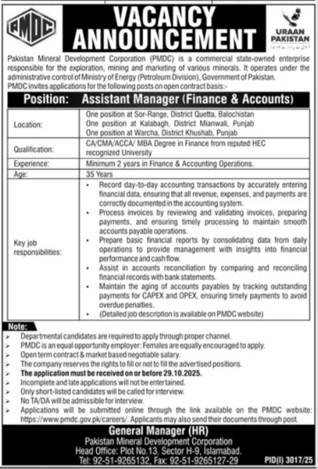 Pakistan Mineral Development Corporation is inviting applications for the following position as per the advertisement published in the daily Jang Newspaper dated 13 October, 2025 for Islamabad, Pakistan: