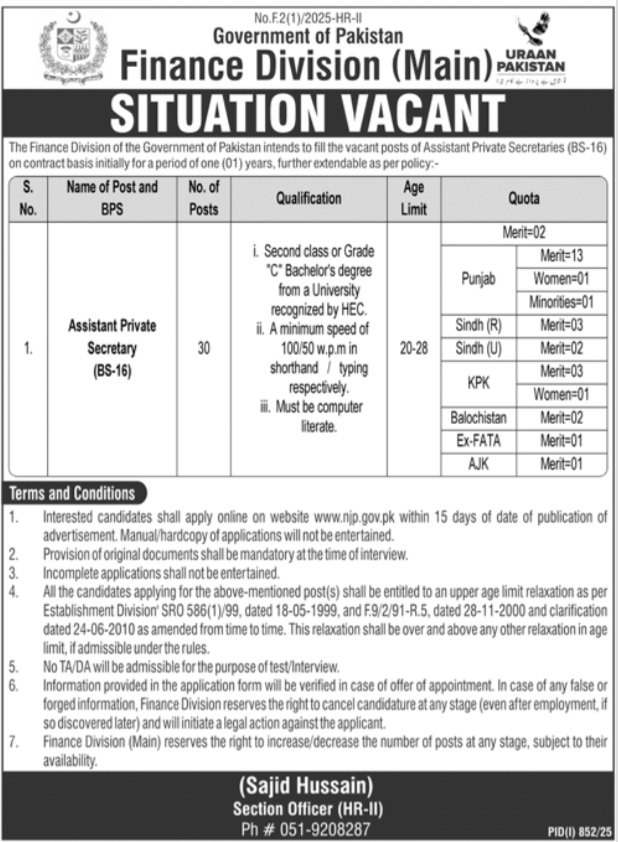 Finance Division invites applications for the above position as per the advertisement published in Jang Newspaper on 3 August, 2025 for Islamabad, Pakistan. Candidates with Bachelor, Master, MS, or BS qualifications will be preferred.