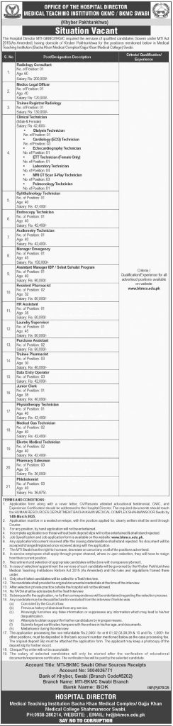 Medical Teaching Institution MTI, including Bacha Khan Medical College (BKMC) and Gajju Khan Medical College (GKMC), Swabi, Pakistan, invites applications from eligible candidates for the following vacant positions as per the advertisement of March 1, 2025, published in the daily Dawn Newspaper: