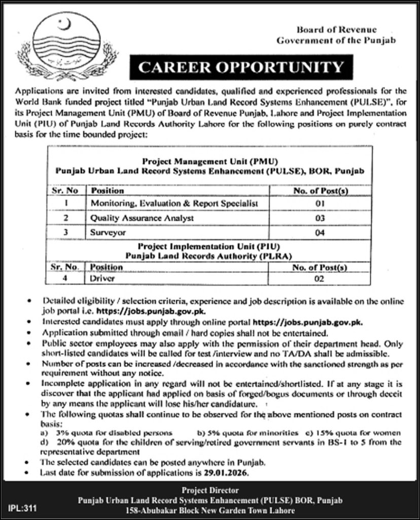 Board of Revenue invites applications for the following posts as per job advertisement published in daily Other Newspaper dated 13 January, 2026 for Lahore, Punjab, Pakistan: