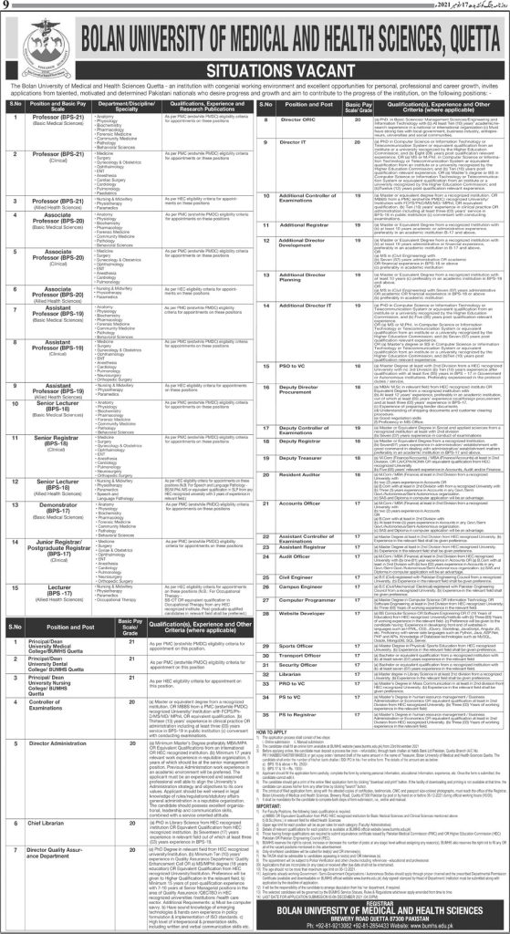 The Bolan University of Medical and Health Sciences, Bawrery Road Quetta, invites applications for the following positions as advertised in the Express Tribune on 16 April, 2025:
