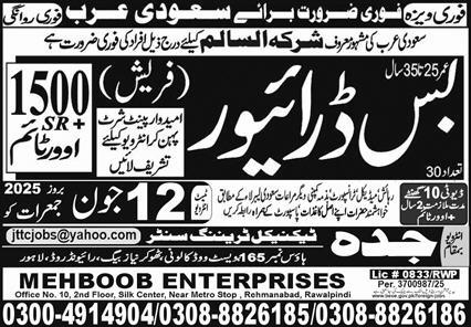 Jeddah Technical Trade Center, based in Dammam and Tabuk, Saudi Arabia, invites applications from eligible candidates for the following driving positions, as per the advertisement published on June 10, 2025, in the Express newspaper: