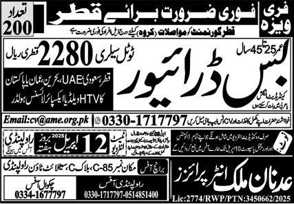 Adnan Malik Enterprises invites applications for the following overseas driving positions, as advertised in the Express Newspaper on 04 April, 2025, for deployment in Doha, Qatar: