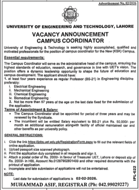 Campus Coordinator Jobs at University Of Engineering And Technology Lahore