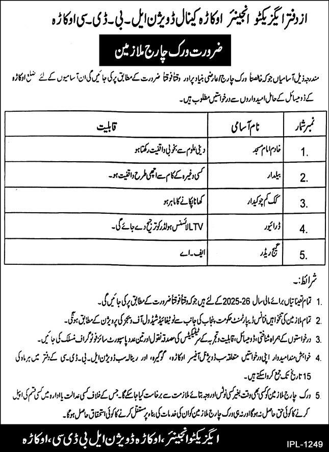 The Irrigation Department, 2/4-L Road, Okara, is inviting applications for the following positions as advertised in the Express Newspaper on 04 April, 2025: