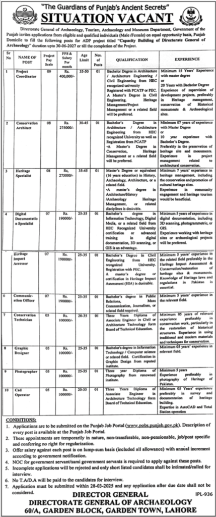 The Department of Archaeology & Museums is inviting applications for the following positions, as per the job advertisement published in Jang on 13 March, 2025: