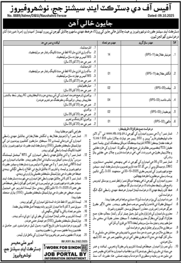 District & Session Judge invites applications for the following positions as per the advertisement published in the daily Kawish Newspaper dated 13 October, 2025 for Naushahro Feroze, Sindh, Pakistan: