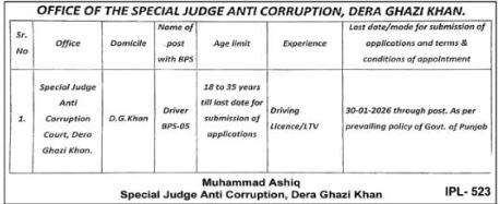 Special Judge is inviting applications for the following positions as per the advertisement published in the daily Nation Newspaper dated 15 January, 2026 for Dera Ghazi Khan, Punjab, Pakistan: