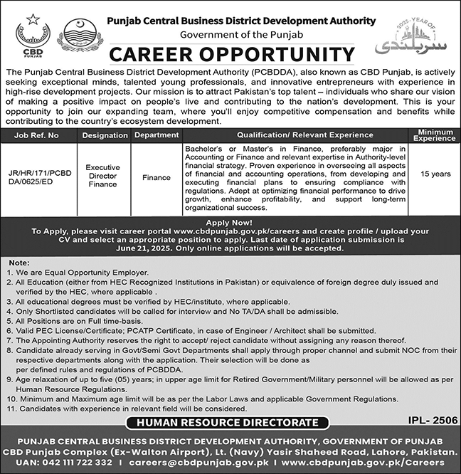 Pakistan Central Business District Development Authority (PCBDDA), located in Garden Town, Lahore, Punjab, Pakistan, invites applications from eligible candidates for the following vacant position as per the advertisement of June 8, 2025, published in the daily Nawaiwaqt Newspaper: