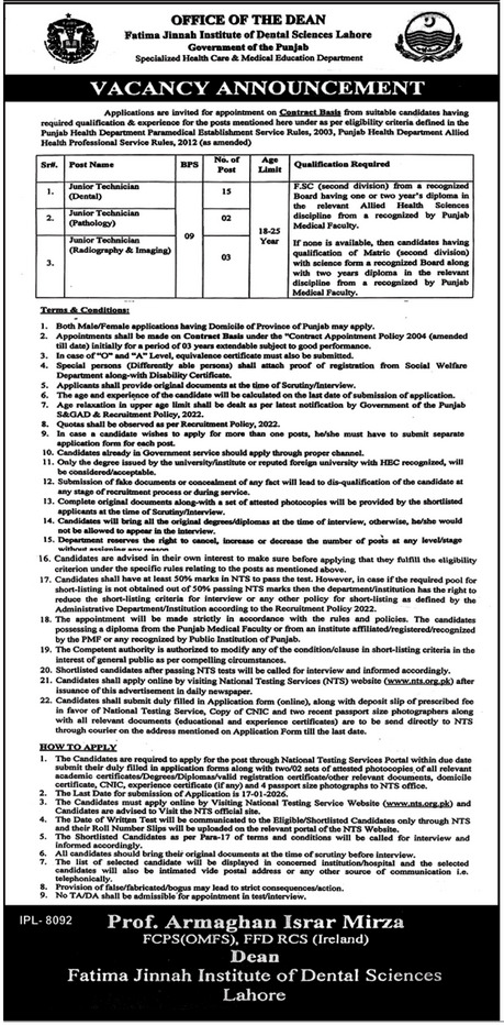 Fatima Jinnah Institute of Dental Sciences is inviting applications for the following positions as per the advertisement published in the daily Nawaiwaqt Newspaper dated 01 January, 2026 for Lahore, Punjab, Pakistan: