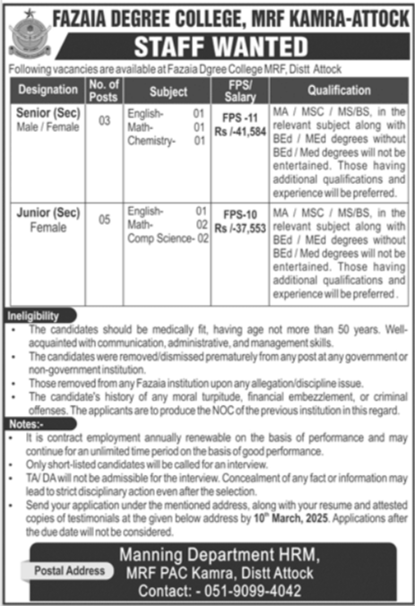 Fazaia Degree College Kamra Attock, Attock Punjab Pakistan invites applications from eligible candidates for the post of Sec Staff and Secondary Section Teacher as per the advertisement of March 2, 2025, published in daily Jang Newspaper. MA, B.ed, MS, Bachelor, M.ed, M.sc, and Master educational qualifications will be preferred.