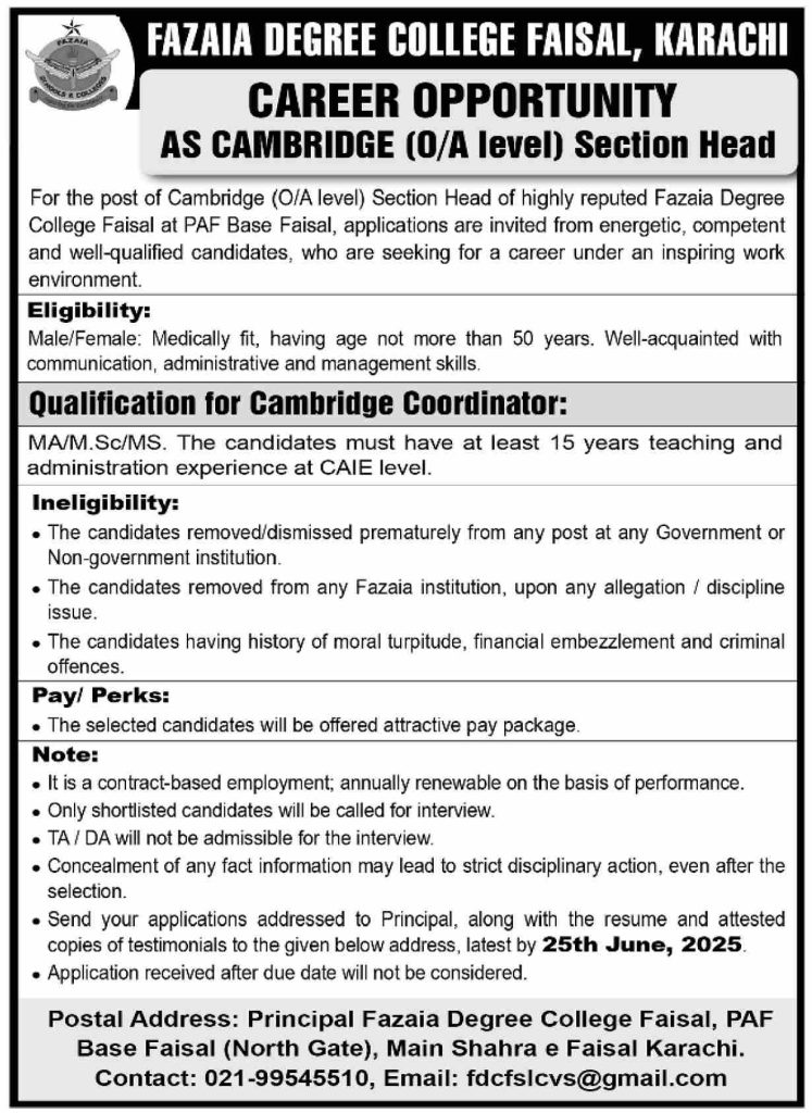 Fazaia Degree College invites applications for the following position as per the advertisement published in the daily Dawn Newspaper dated 16 June, 2025 for location Karachi, Sindh, Pakistan: