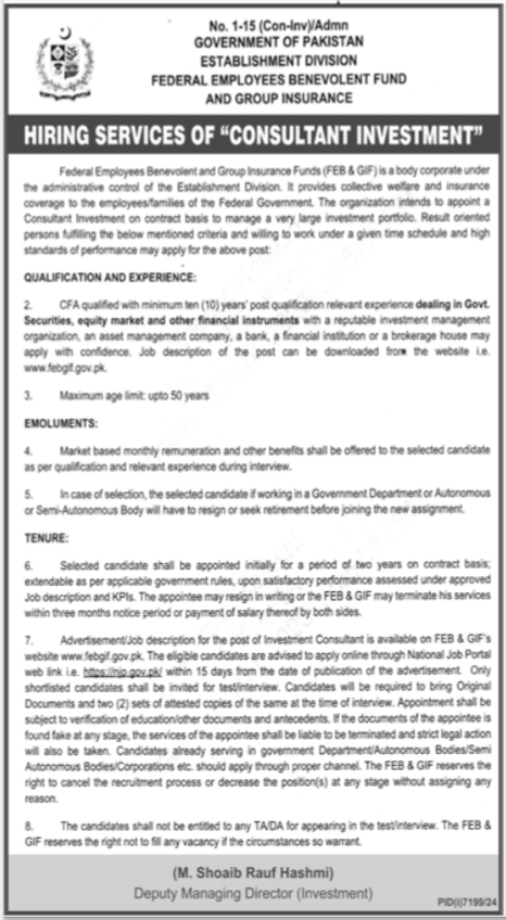 Federal Employees Benevolent & Group Insurance Funds Consultant Posts – Islamabad 2025