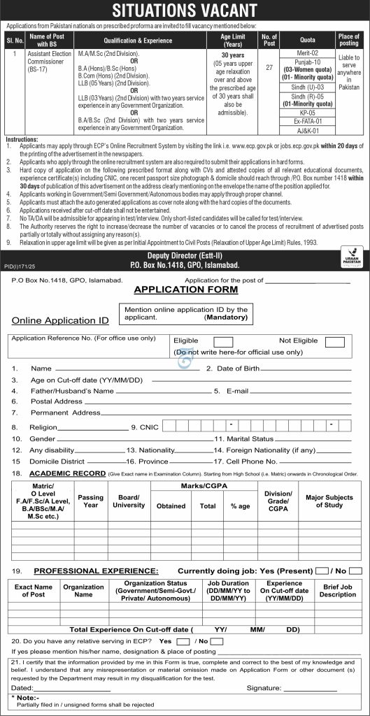 Government Organization jobs advertisement dated about 9 July 2025 in daily Aaj Newspaper invites applications for the vacant post of Assistant Election Commissioner in Islamabad, Islamabad Pakistan. Candidates with Bachelor, Master, and MS etc. educational background will be preferred.
