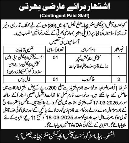 Government Special Education Centre, Faisalabad, Punjab, Pakistan, invites applications for the following positions as per the March 11, 2025 advertisement in Express Newspaper: