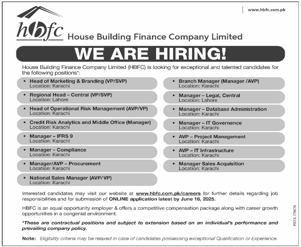 House Building Finance Company Limited (HBFCL), located on Shahrah-e-Faisal, Karachi, Pakistan, invites applications from eligible candidates for the following vacant positions as per the advertisement of June 3, 2025, published in the daily Dawn Newspaper: