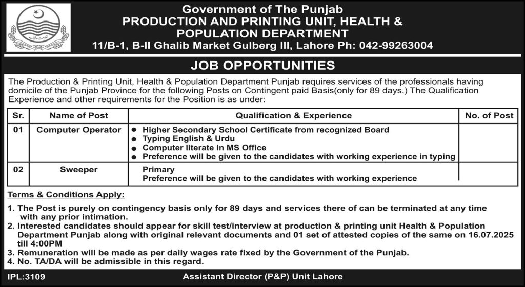 Health & Population Department is inviting applications for the following positions as per the job advertisement published in a daily newspaper on 08 July, 2025 for Lahore, Punjab, Pakistan: