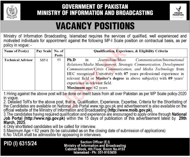 Ministry of Information and Broadcasting invites applications for the following vacancy, as advertised in Express Tribune Newspaper on 17 March, 2025: