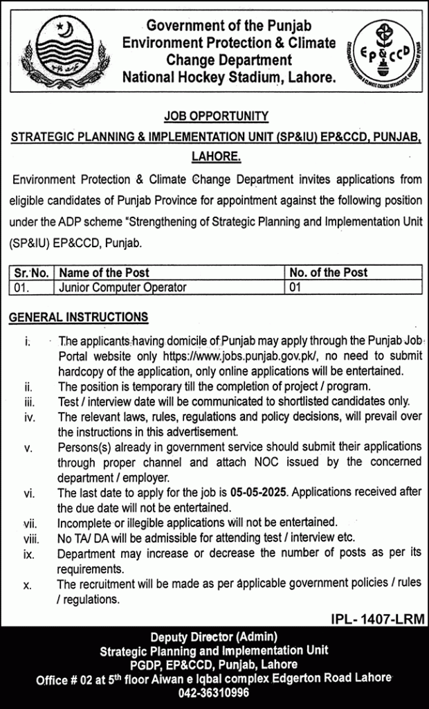 Latest Environment Protection & Climate Change Department Computer Posts – Lahore 2025