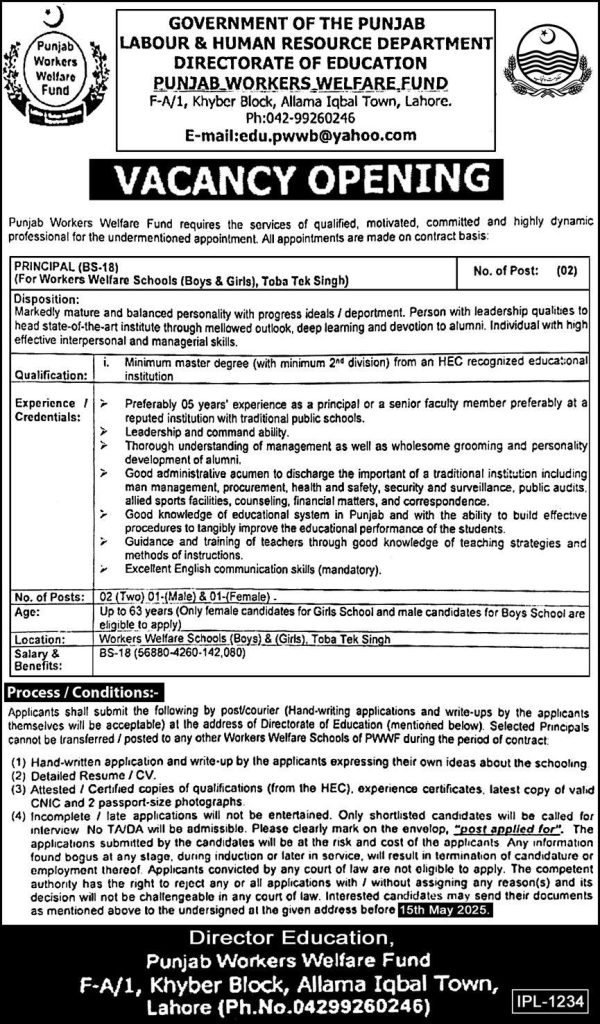 These positions are based in Allama Iqbal Town (Lahore), Toba Tek Singh, and Lahore, Punjab. Interested candidates can apply for the latest Government Education jobs at the Punjab Workers Welfare Fund before 15 May, 2025, or as per the closing date mentioned in the newspaper ad. Read the complete ad online for detailed application instructions.