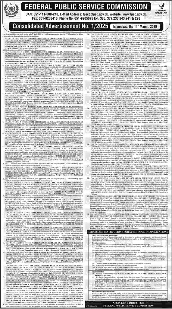 Federal Public Service Commission (FPSC) invites applications for the following vacancies, as advertised in Kawish Newspaper on 17 March, 2025: