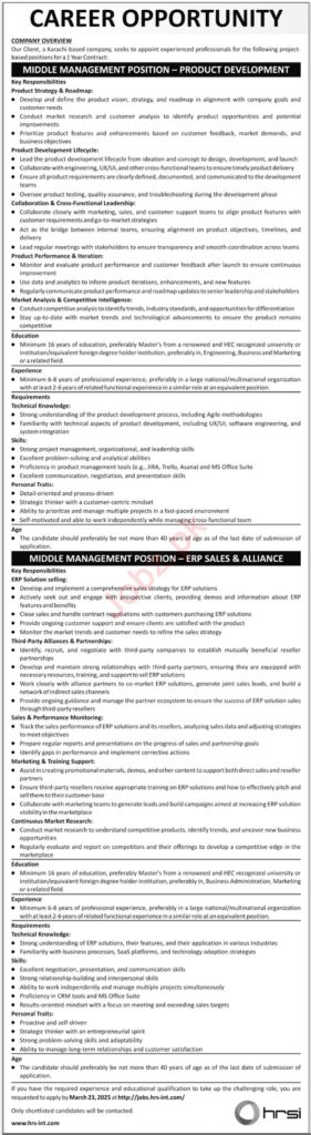 Human Resource Solution International (HRSI) jobs advertisement dated 9 March 2025 in daily Jang Newspaper invites applications for the vacant posts of: