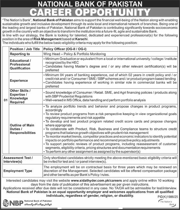National Bank of Pakistan NBP Karachi, karachi Sindh Pakistan invites applications from eligible candidates for the post of policy officer as per advertisement of December 8, 2025 published in daily Nation Newspaper. Candidates with MS, Bachelor and Master etc. educational background will be preferred.
