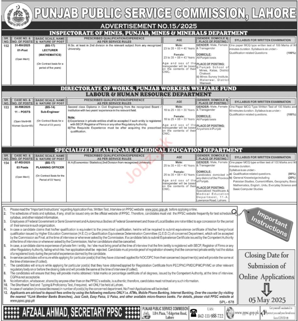 Punjab Public Service Commission (PPSC), Egerton Road Lahore, invites applications for the following positions as advertised in the Daily Express Tribune on 20 April, 2025: