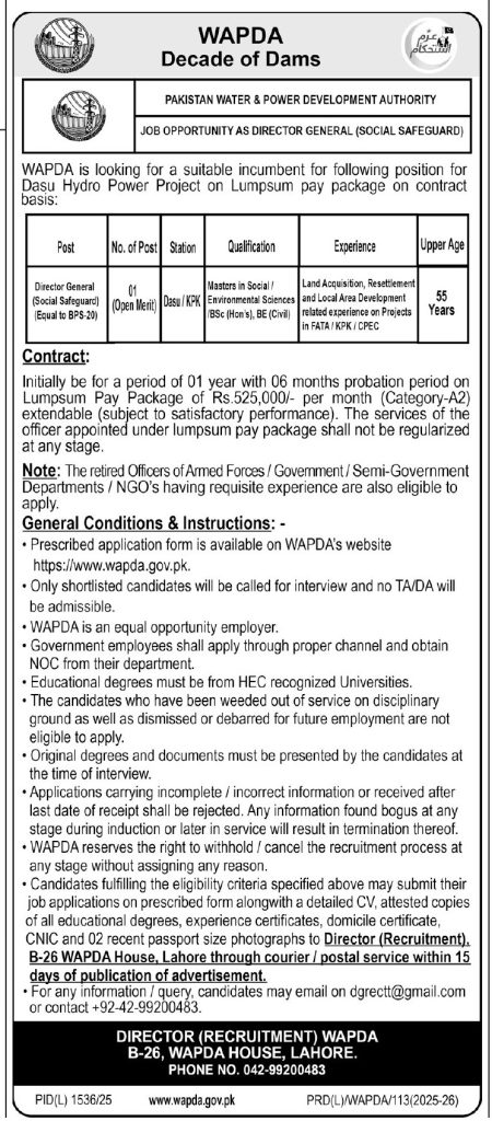 Water and Power Development Authority WAPDA jobs advertisement dated about 8 December 2025 in daily Express Tribune Newspaper invites application for the vacant post of director general in Lahore, lahore Punjab Pakistan. MS, Bachelor and Master etc. educational qualification will be preferred.