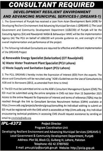 Local Government & Community Development Department invites applications for various management positions as per advertisement published in the News Newspaper on 2 September, 2025 for Lahore, Punjab.