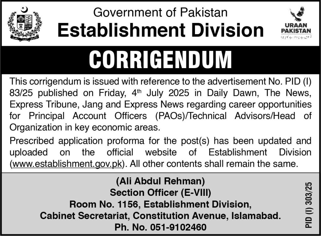Establishment Division invites applications for the above positions as per the advertisement published in Other Newspaper on 12 July, 2025 for its office in G-5, Islamabad. Preferred qualifications are Bachelor and Master degrees.