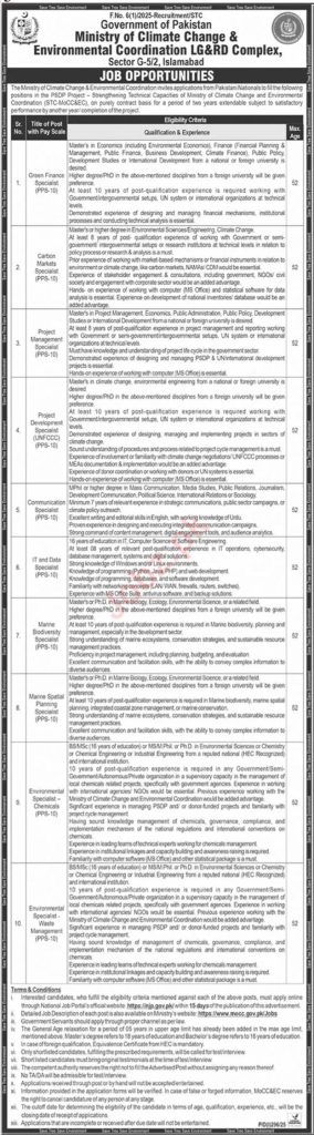 Ministry of Climate Change invites applications for the above-mentioned positions as per the job advertisement published in Jang Newspaper on 13 July, 2025. Candidates with Bachelor, Master, or MPhil degrees are eligible to apply.