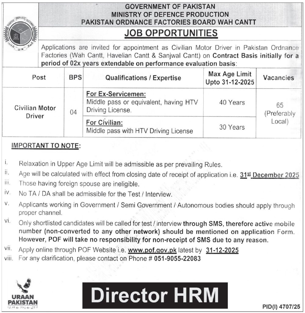 Ministry Of Defence Production Wah Cantt Job Notice 2025
