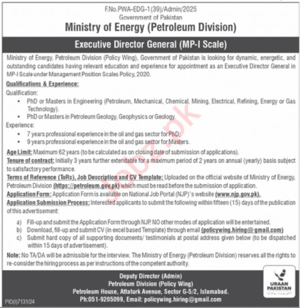 Ministry of Energy, G-5 Islamabad, invites applications for the following position as advertised in the Daily Jang newspaper on 20 April, 2025:
