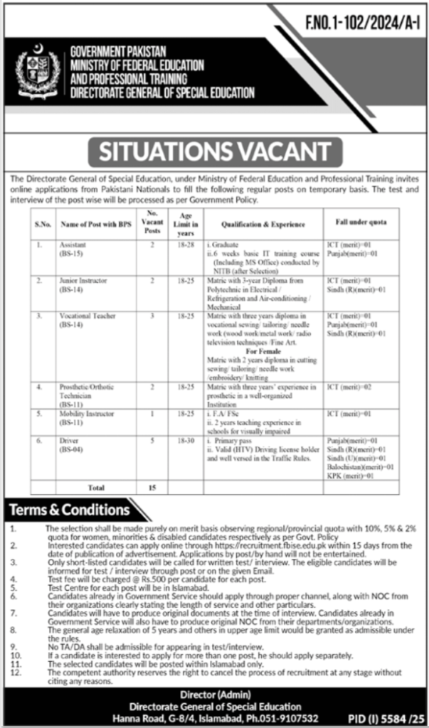 Ministry of Federal Education & Professional Training MOENT is inviting applications for the following positions as per the advertisement published in the daily Jang Newspaper dated 08 January, 2026 for Islamabad, Pakistan: