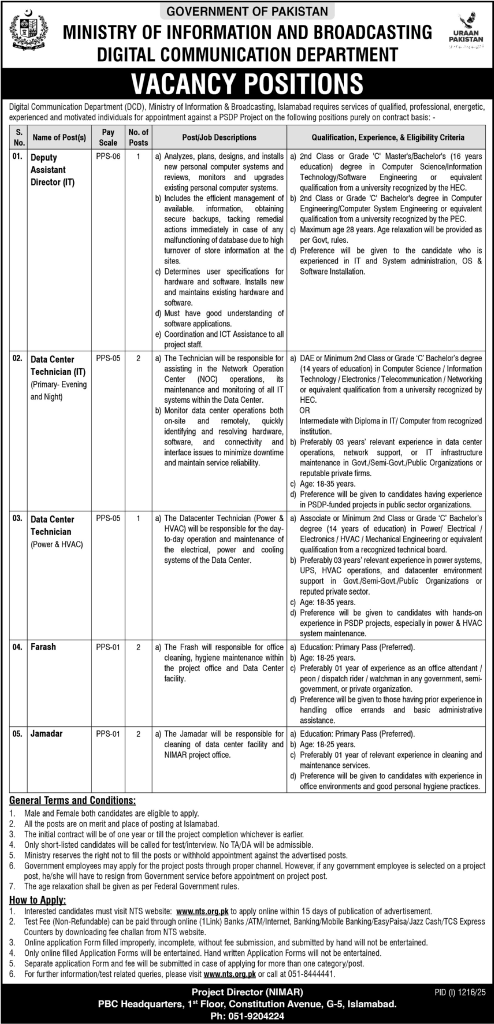 Ministry of Information and Broadcasting invites applications for the above posts as per job advertisement published in daily Express Tribune Newspaper of August 11, 2025 for location G-5 Islamabad, Islamabad, Pakistan.