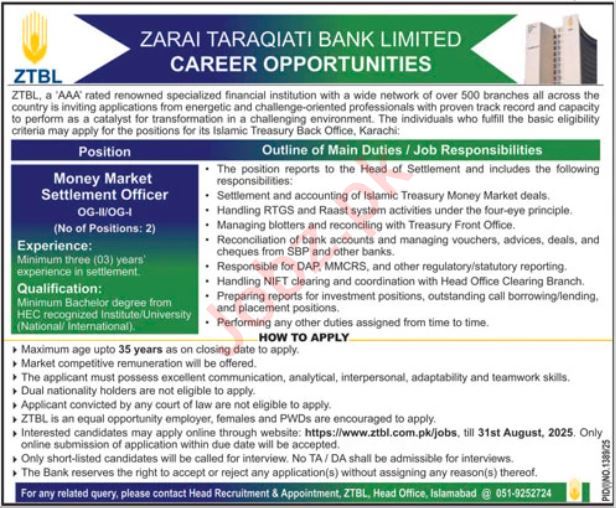 Money Market Settlement Officer Position At ZTBL Job