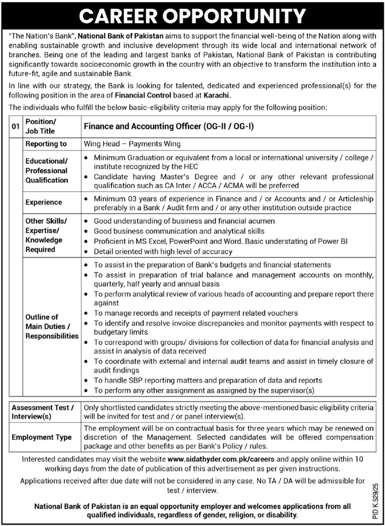 National Bank of Pakistan (NBP) invites applications for the above position as per job advertisement published in the daily Express Tribune dated 11 August, 2025 for Karachi, Sindh, Pakistan.