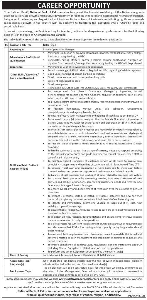 National Bank of Pakistan NBP latest Government Bank jobs and others can be applied till 22 October 2025, or as per the closing date in the newspaper ad. Read the complete ad online to know how to apply for the latest National Bank of Pakistan NBP job opportunities.
