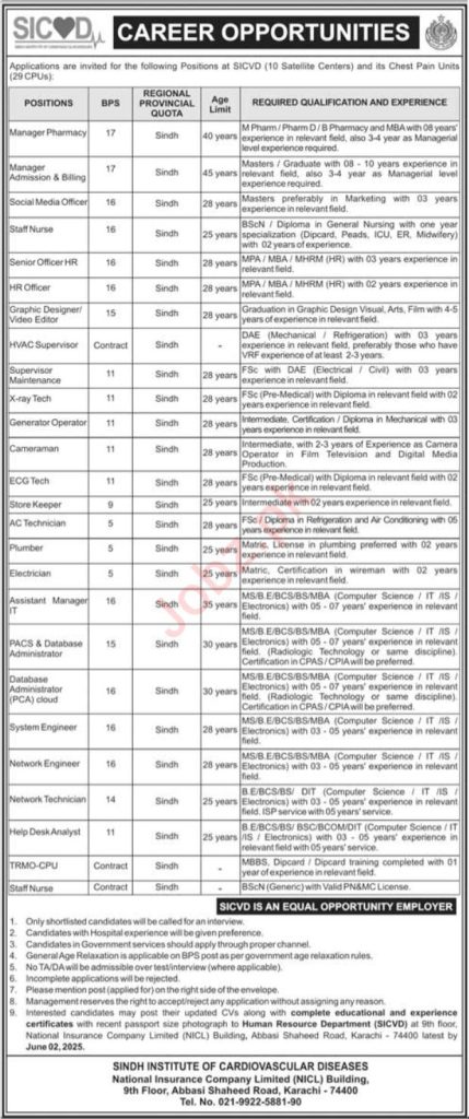 The National Institute of Cardiovascular Diseases (NICVD) invites applications for the following vacancies, as per the job advertisement published in daily Dawn Newspaper on 19 May, 2025: