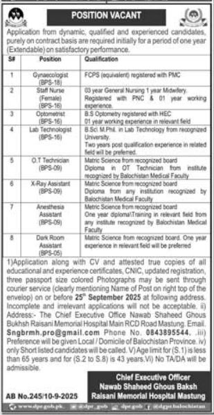 New Government Jobs in Mastung Medical Jobs in Nawab Shaheed Ghous Bakhsh Raisani Memorial Hospital SNGBRMH have been announced in different newspapers and as per ad closing date around 25 September, 2025. So apply before the closing date and also read carefully details of job online in the advertisement where complete procedure of application is available.