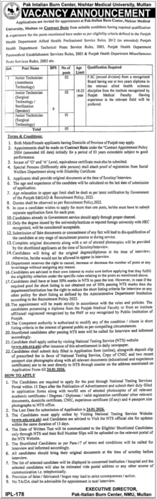 Nishtar Medical University NMU is inviting applications for the following positions as per the advertisement published in the daily Jang Newspaper dated 08 January, 2026 for Multan, Punjab, Pakistan: