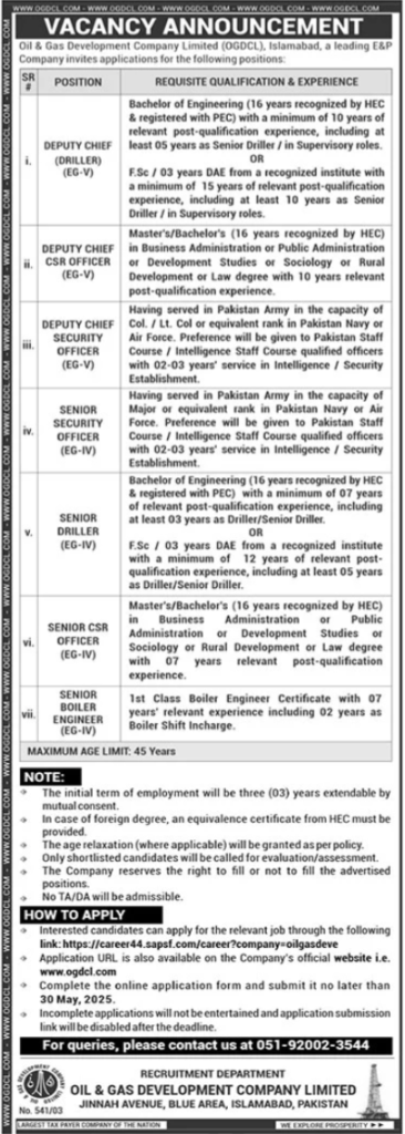 Oil & Gas Development Company Limited (OGDCL), Blue Area Islamabad, invites applications for the following positions, as advertised in The News Newspaper on 14 May, 2025: