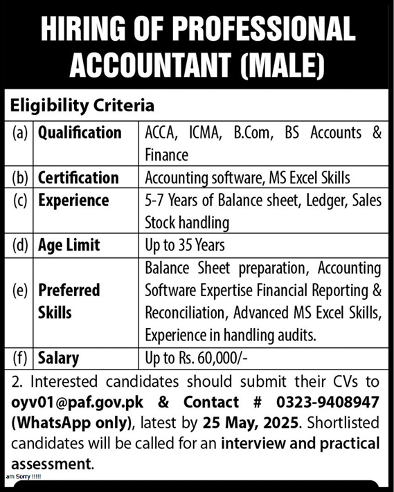 Pakistan Air Force (PAF) is inviting applications for the following position as per the job advertisement published in the daily Other Newspaper on 19 May, 2025 for Islamabad, Pakistan: