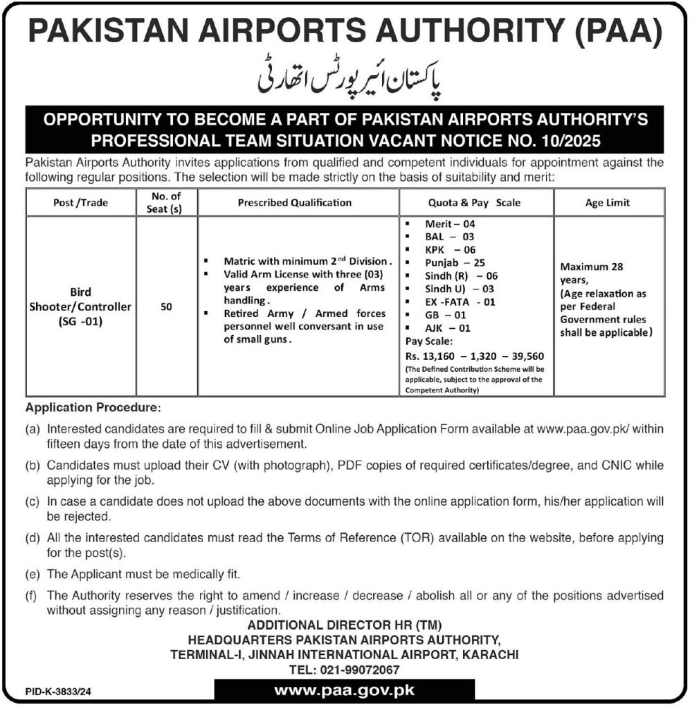 Pakistan Airports Authority (PAA) is inviting applications for the following positions as per the job advertisement published in the daily Express Tribune on 13 June, 2025 for Karachi, Pakistan: