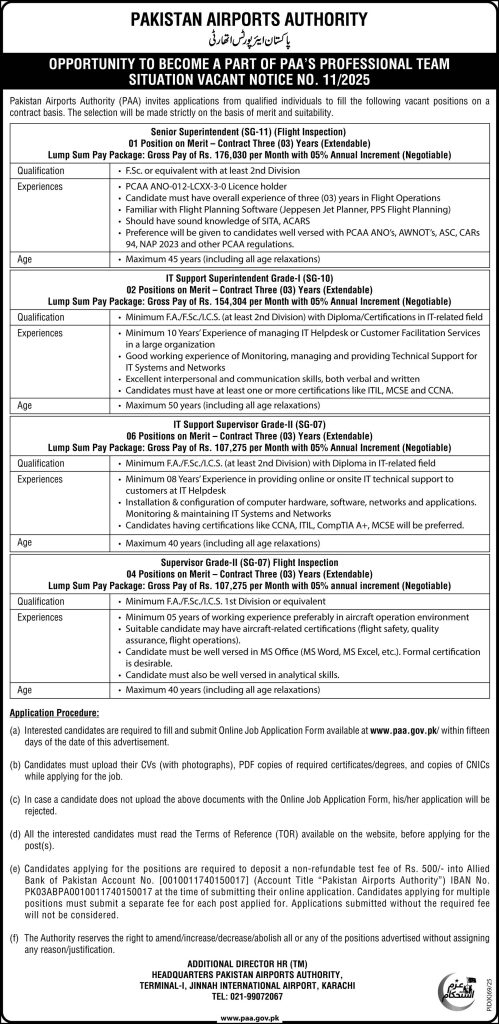 Pakistan Airports Authority (PAA) invites applications from eligible candidates for the above-mentioned posts as per the advertisement published in Other Newspaper on 15 July, 2025. Candidates with Bachelor, Master, MS, or BS qualifications are encouraged to apply.