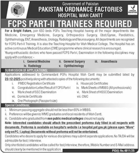 Pakistan Ordnance Factories POF Hospital, Wah Cantt, Punjab, invites applications for the position of FCPS Part II Trainee, as advertised in the Dunya Newspaper on 11 December 2025.