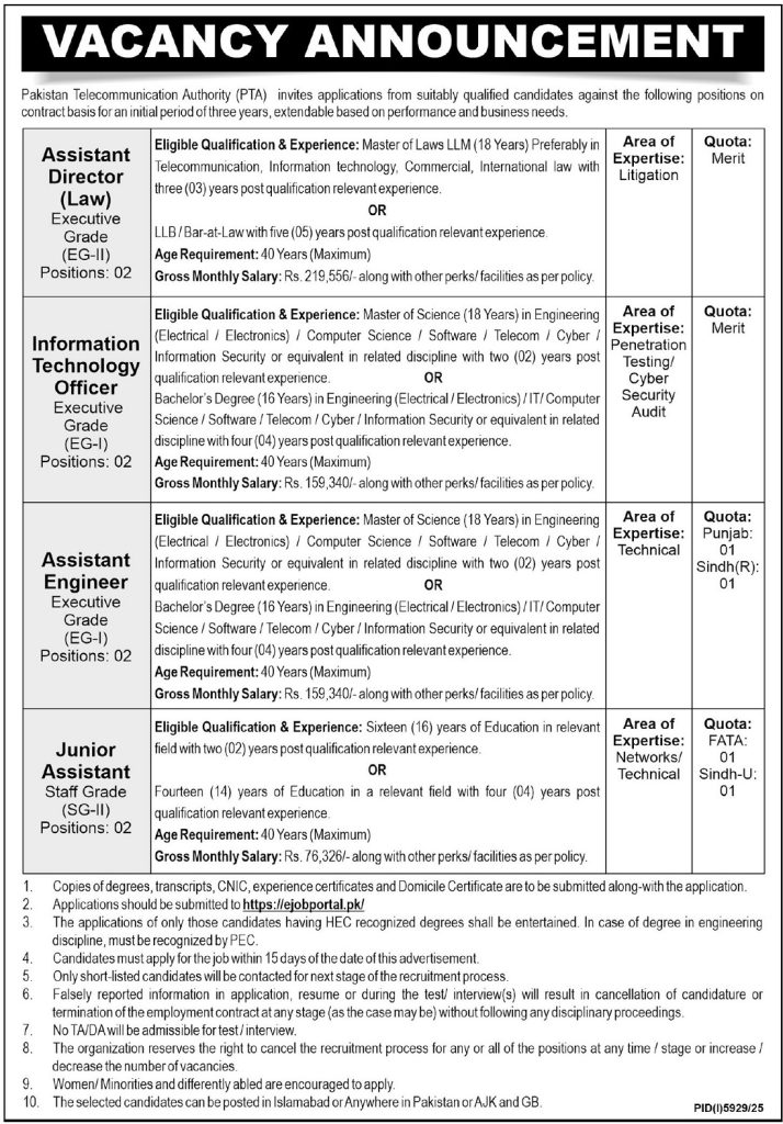 Pakistan Telecommunication Authority (PTA) invites applications for the above posts as per job advertisement published in Express Tribune Newspaper dated 19 January, 2026 for Islamabad, Pakistan.